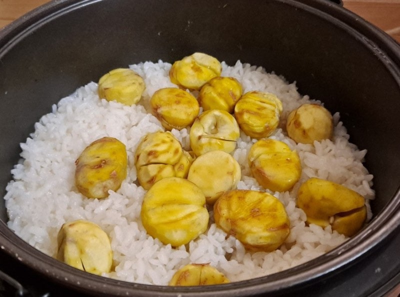- 밥솥에 쌀, 밤, 소금 약간 넣고 평소보다 약간 적게 물을 넣어 밥 짓기.