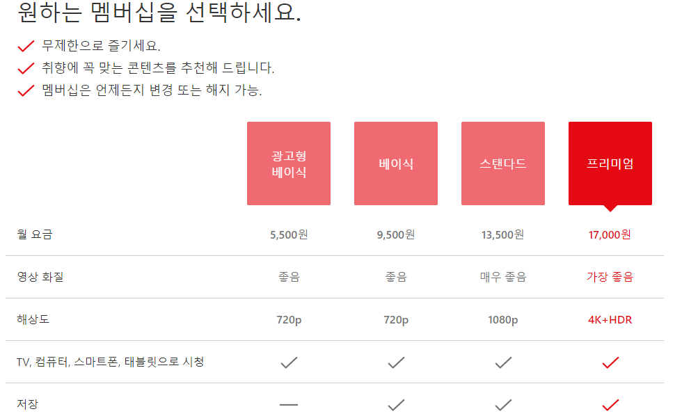 넷플릭스 가격 페이지에 가면 아래와 같이 뜬다.