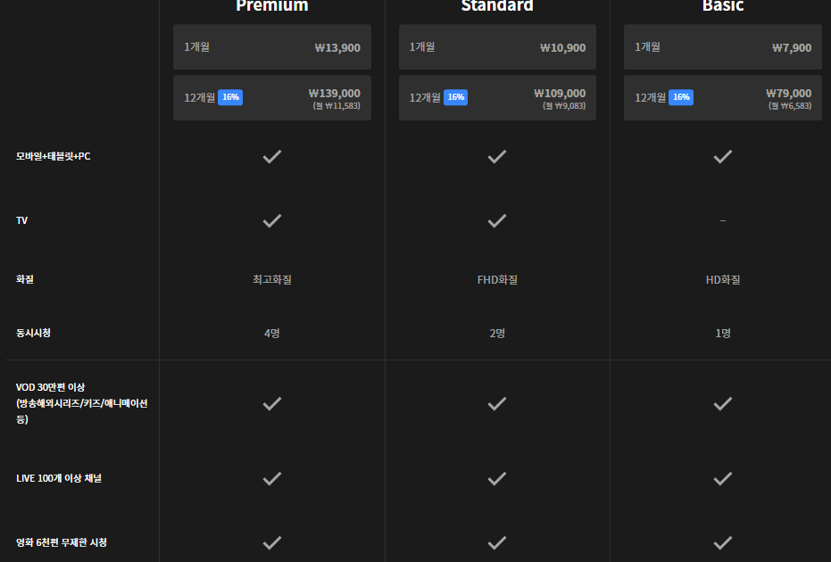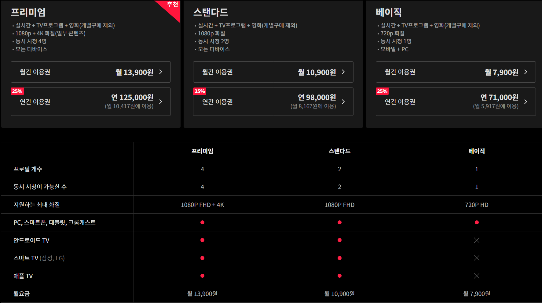 웨이브는 세가지 요금제로 나뉘어져 있고 가격은 아래와 같다.