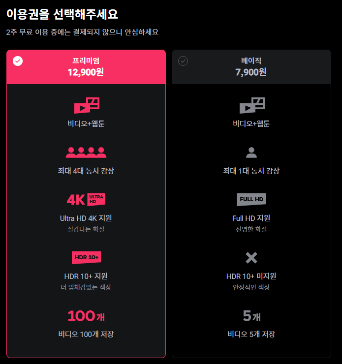 사실 왓챠는 이용해 보지 못해 잘은 모르나 가격은 이렇게 두 가지로 형성되어 있따.