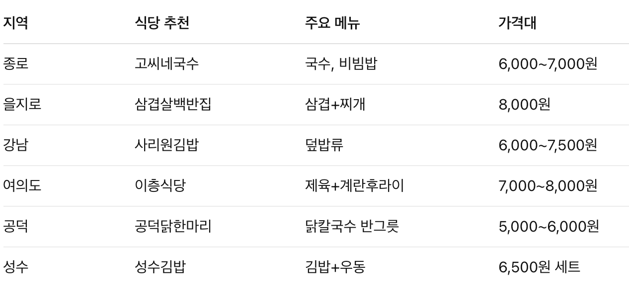 ✅ 7. 비즈니스 지구 인기 저가 식당 예시 (서울 중심)