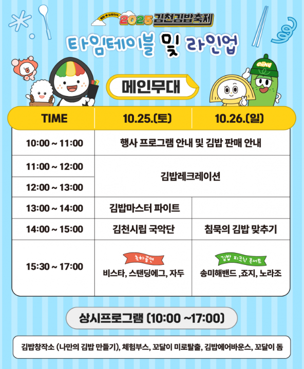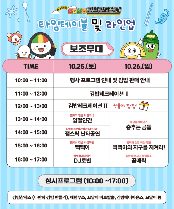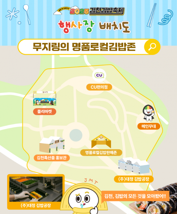 - 중간에 김밥 체험존 또는 이벤트 참여 (댄스 챌린지 등)