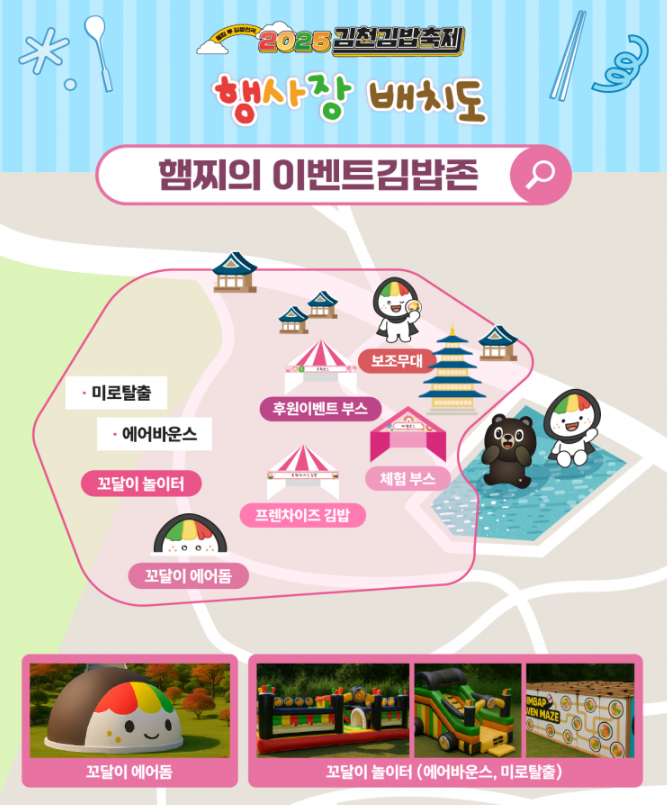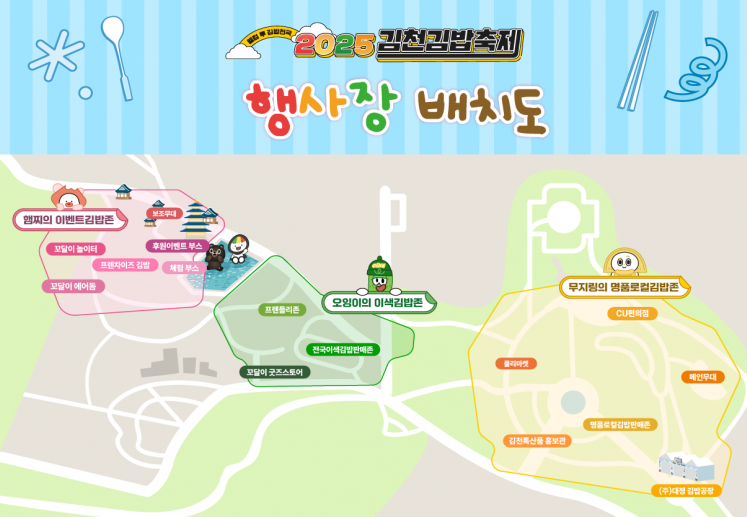 - 테마 구역: 김밥의 주재료(단무지, 오이, 햄)를 활용한 ‘무지링존’, ‘오잉존’, ‘햄찌존’ 등 구역 구성.