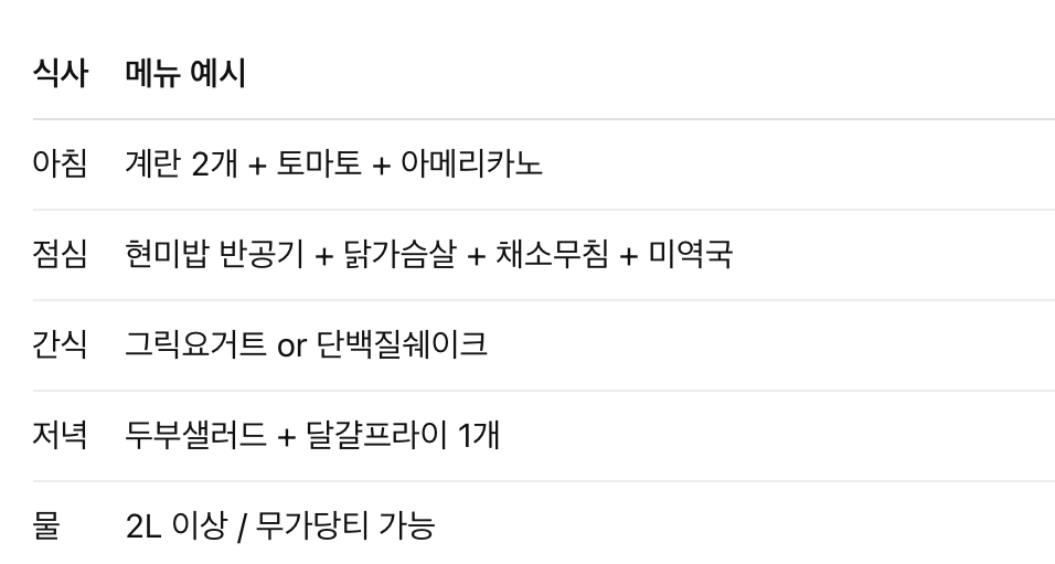 - 닭가슴살, 두부, 생선, 계란 등 단백질 많은 식단 먹기 - 저녁 7시 이후 금식 (간헐적 단식 16:8)