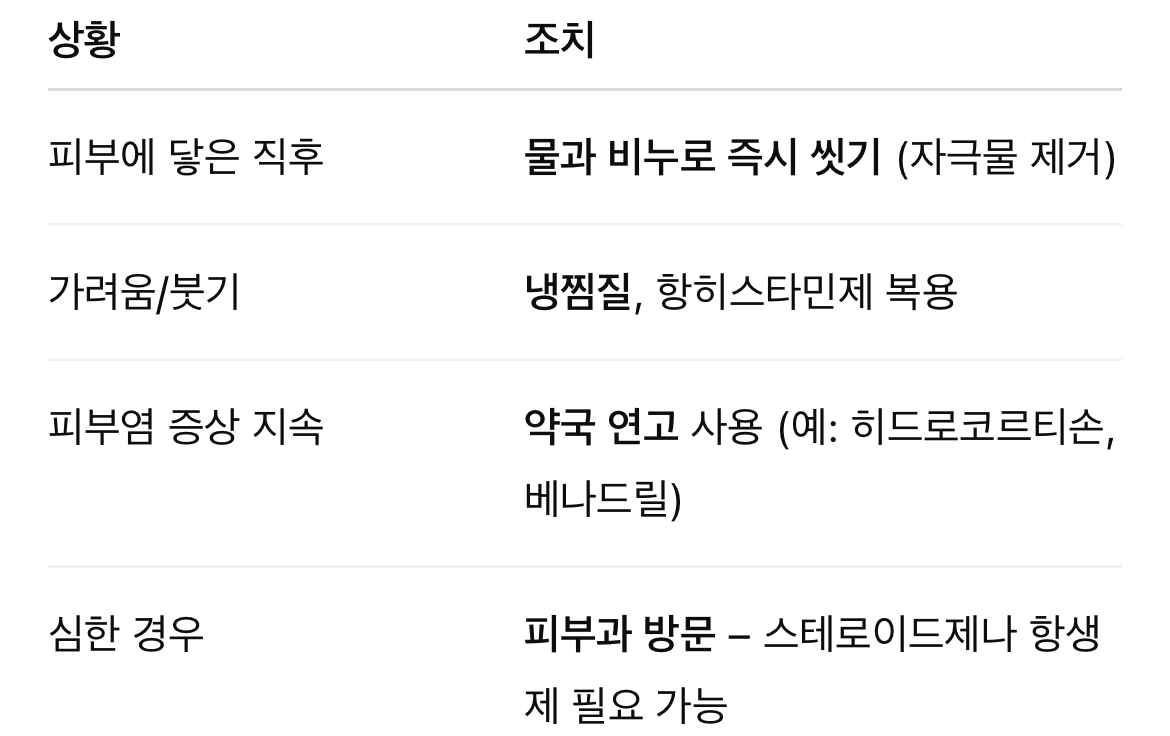 민간요법 자제: 식초, 소금물 등은 오히려 악화시킬 수 있음