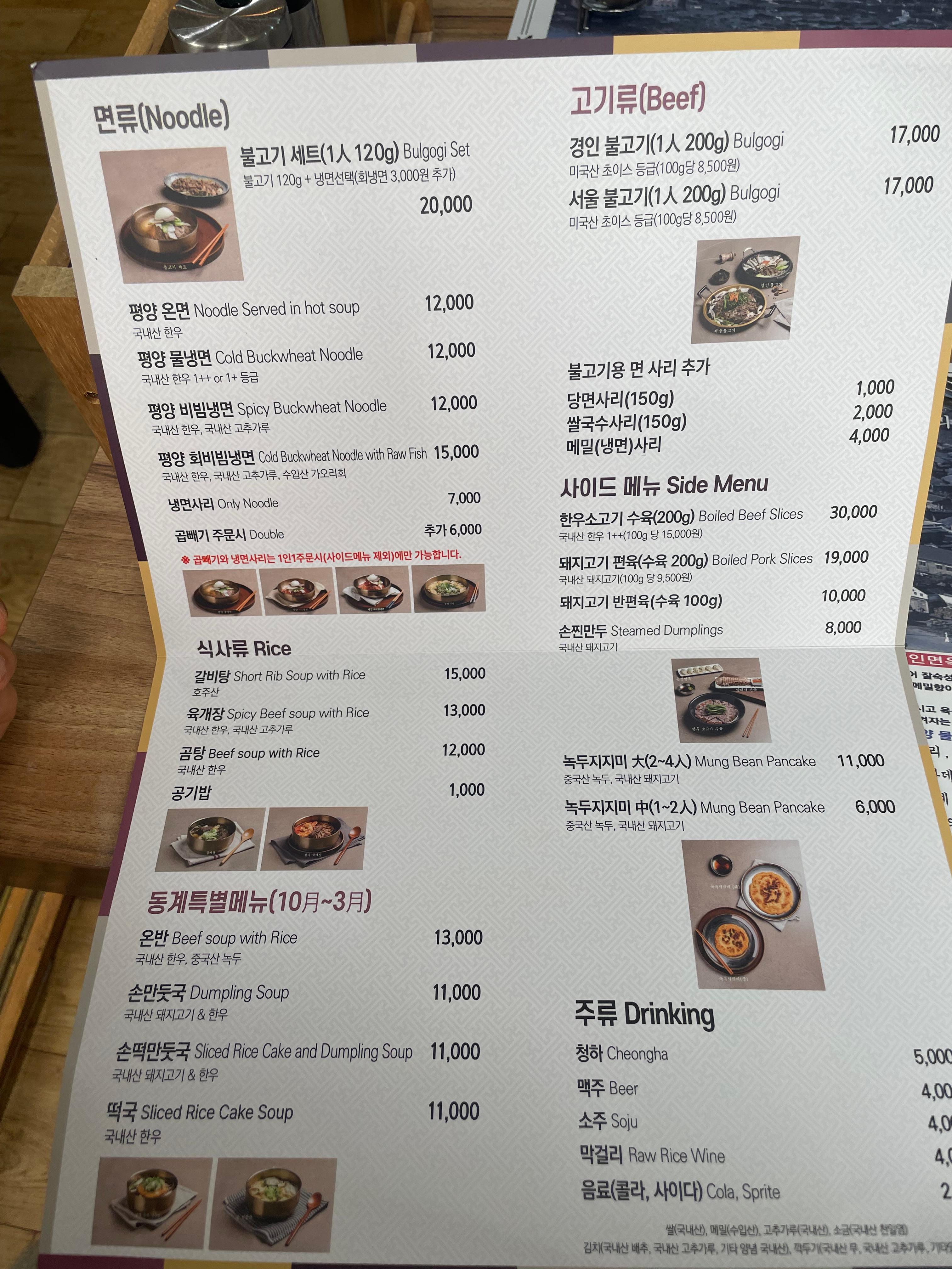여기 대표 메뉴는 평양 온면과 평양물냉면 그리고 소고기 수육과 돼지고기 수육이다.