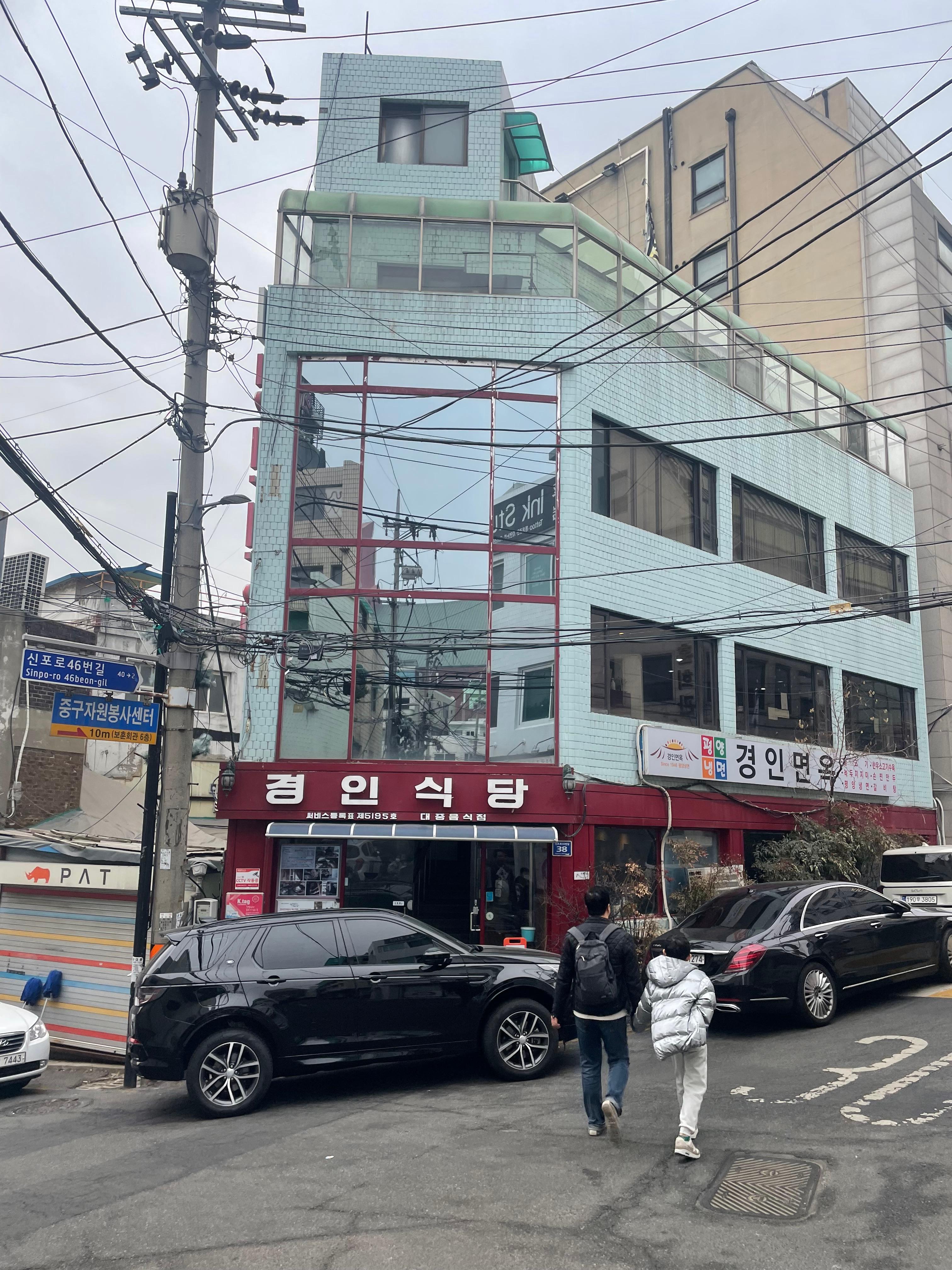 식당은 저 건물이 모두 쓰고 있고, 좁고 긴 스타일이라 내부가 넓진 않다. 특히 1층은 주방도 같이 있어서 자리가 좁고