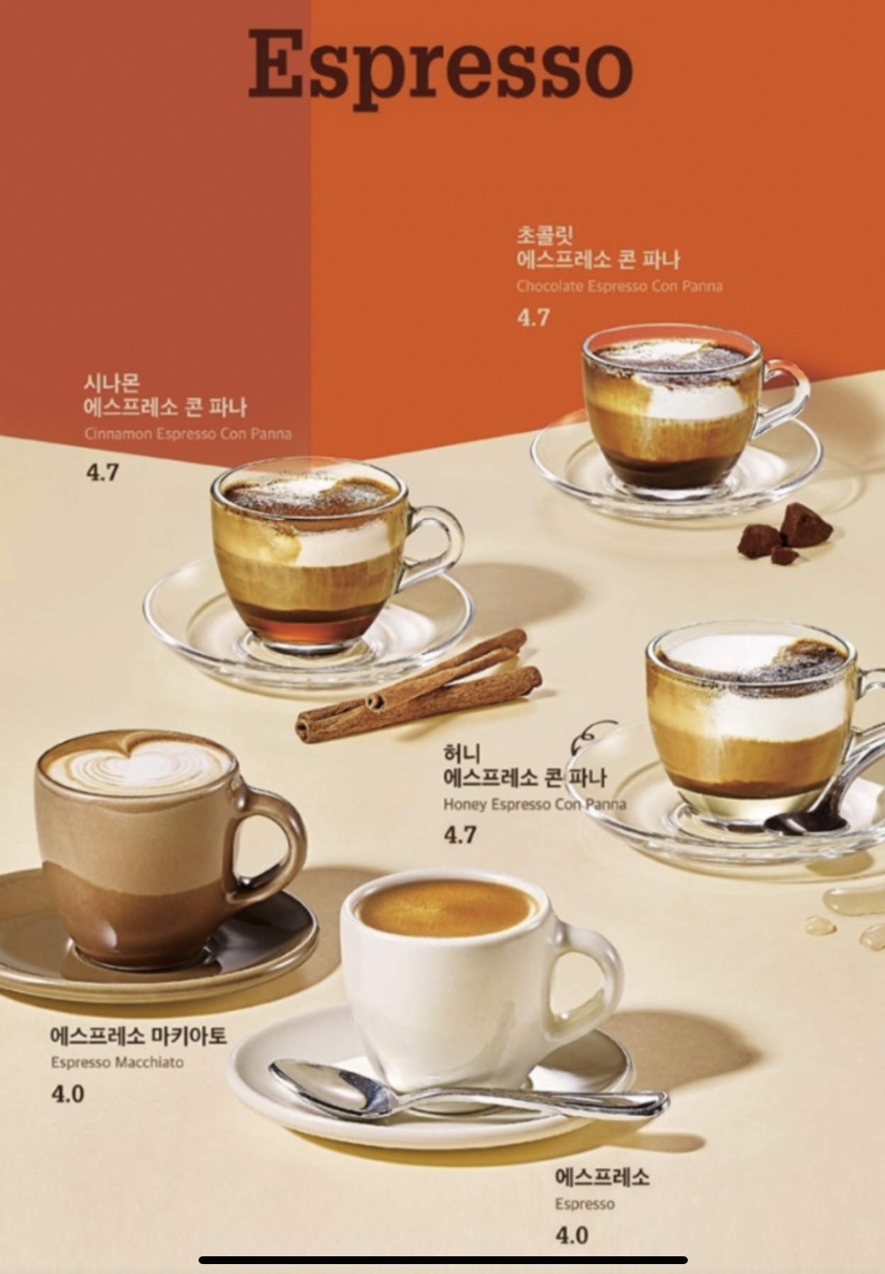 그리고 사실 요즘 너무 대용량 커피들이 많아서 커피를 마시다 좀 질리기도 하는데데요 에스프레소 콘 파냐는 워낙 작은 잔에 나와서 아쉽기까지 하니 여러모로 매력적이다.