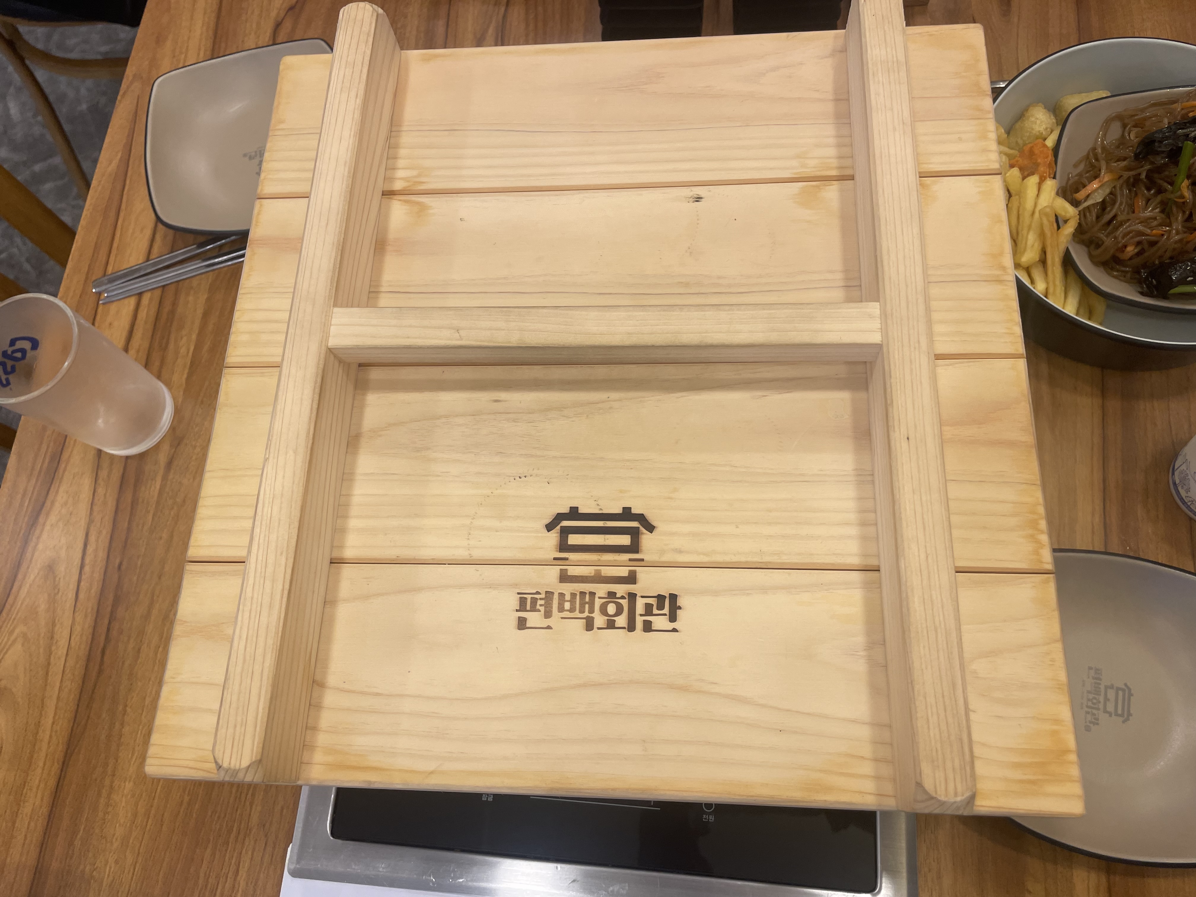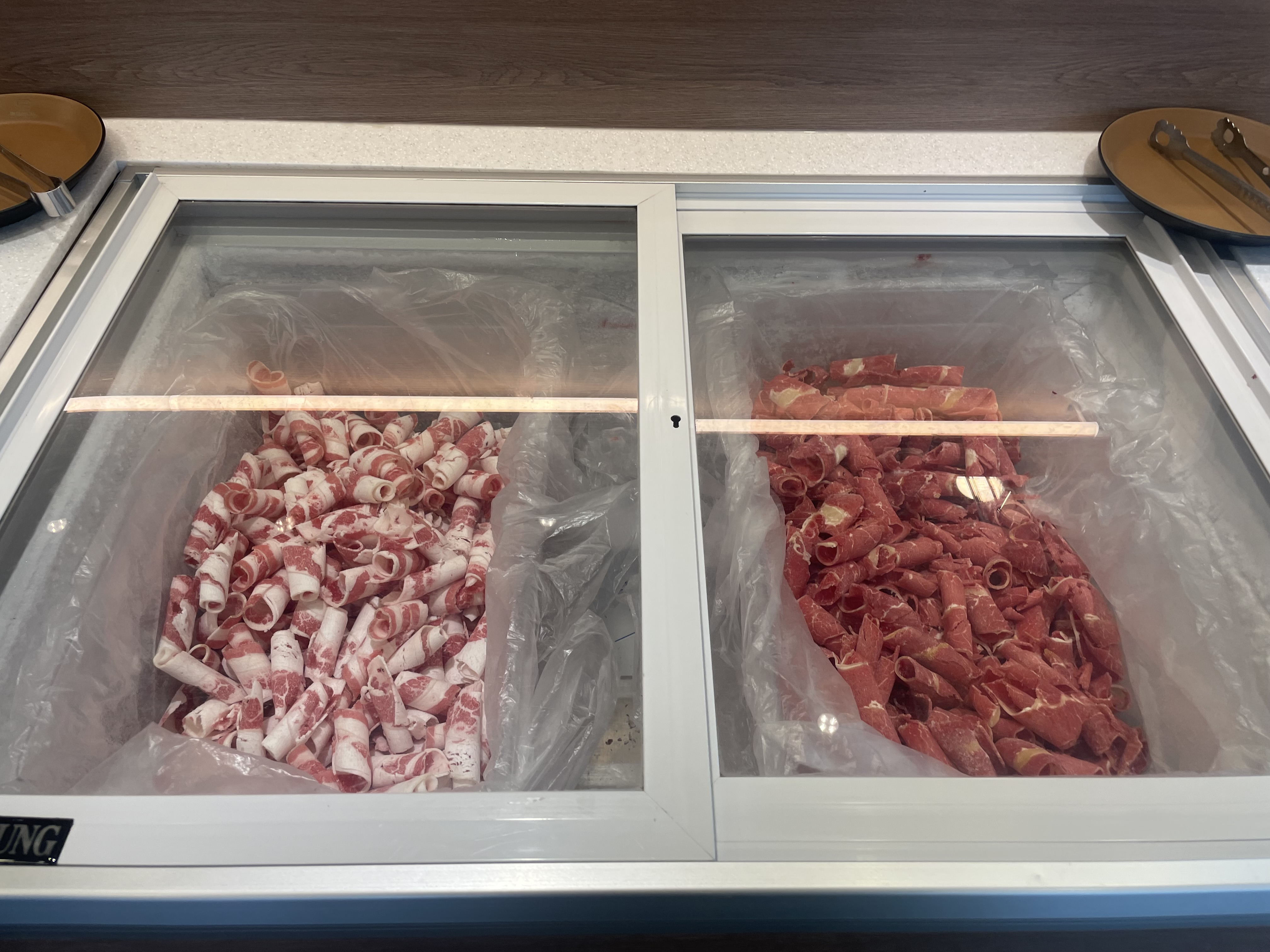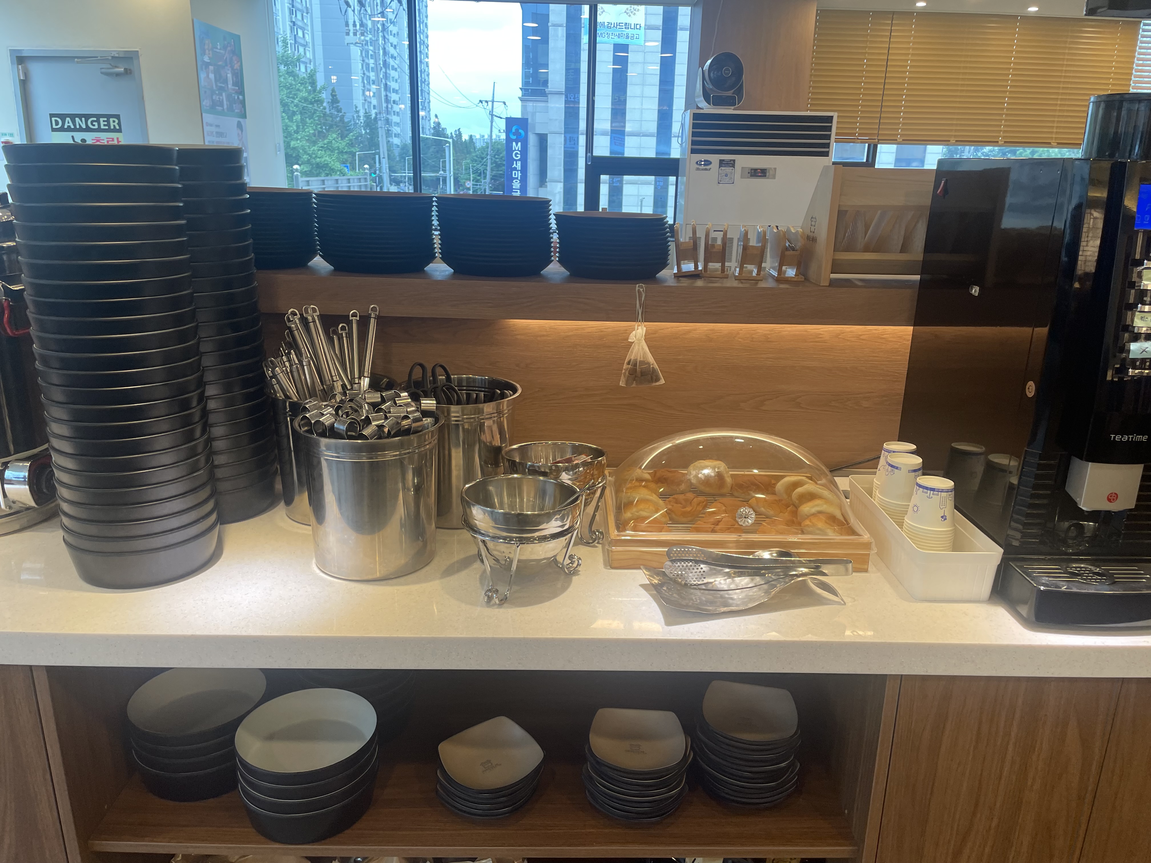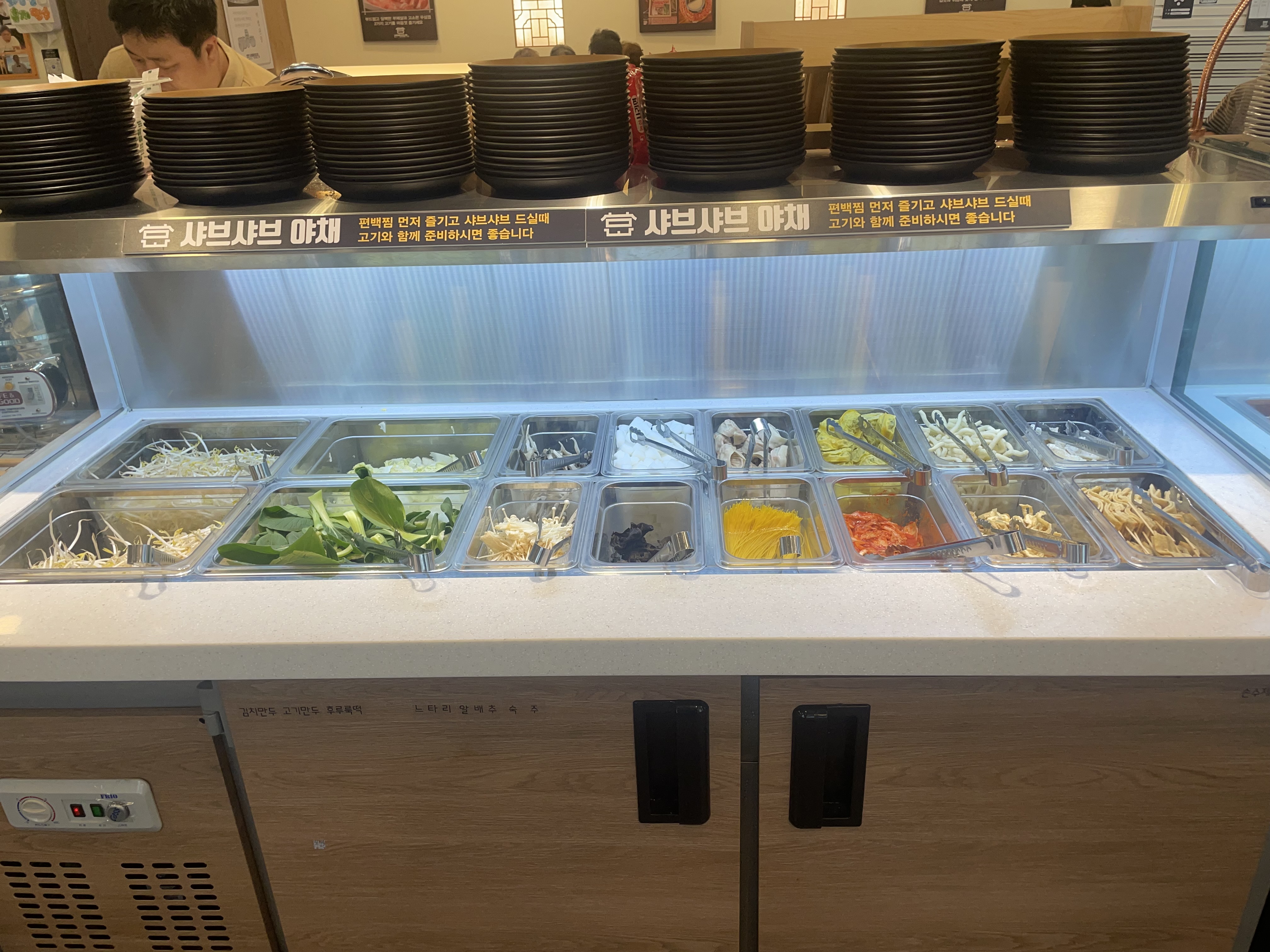 안은 테이블만 30개가 넘게 있고, 가운데에 샤브샤브야채와 월남쌈 야채, 그리고 약간의 음식들과 (떡볶이, 볶음밥 등), 빵과 수프를 갖다 먹을 수 있는 뷔페 테이블이 놓여 있다.