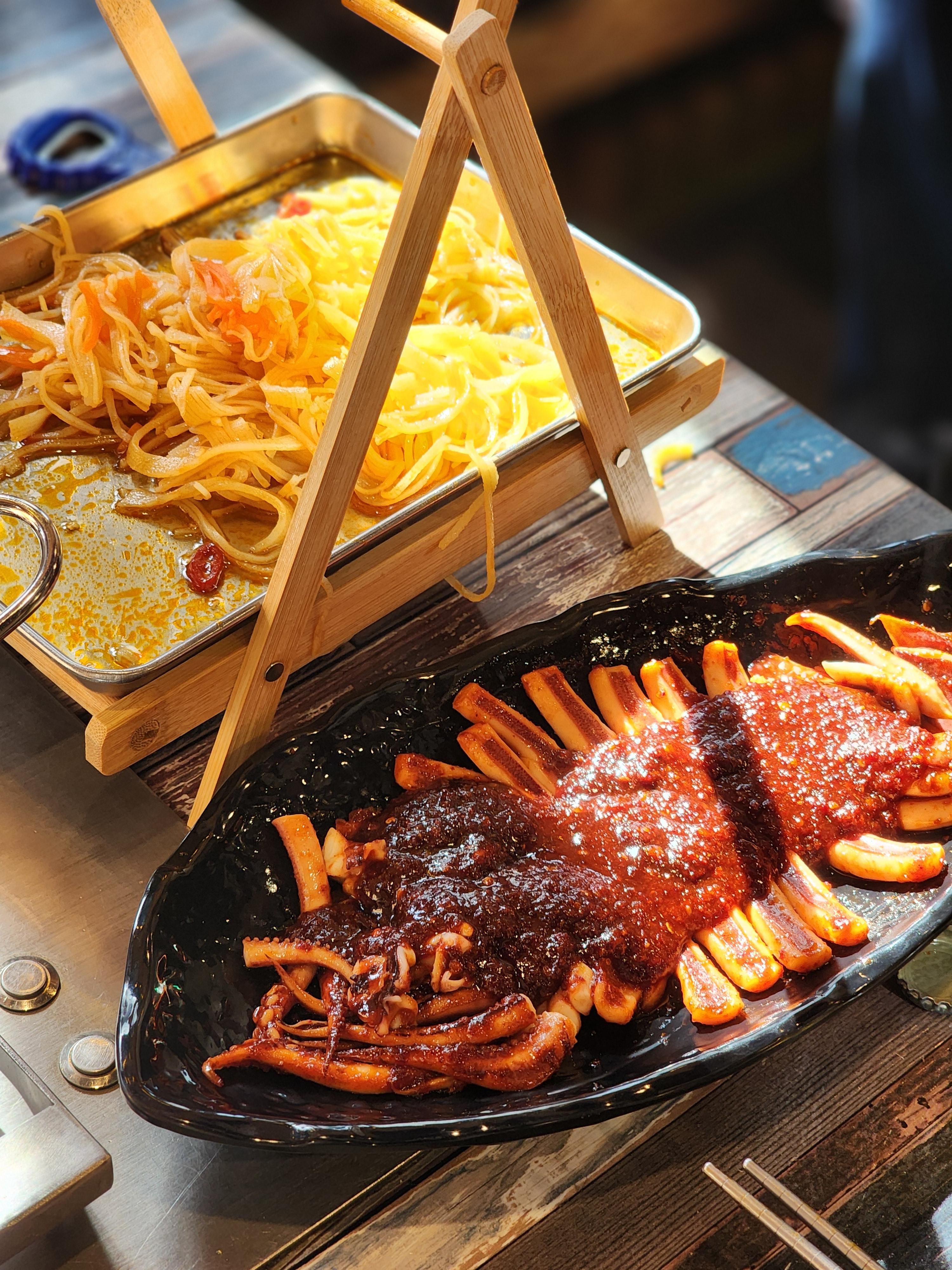 오징어를 데친다음에 저 빨간 양념에 묻힌것 같은데 저 빨간 양념이 완전 한국맛이다.