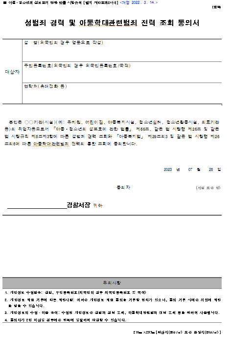 그리고 성범죄 경력 및 아동학대관련범죄 전력 조회 신청서를 작성한다.