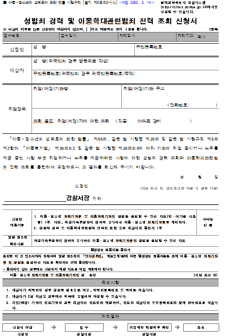아파트 경비 성범죄 경력 및 아동학대 관련 범죄 조회시에는 해당 경찰청에 가서 직접 조회를 해야 한다.