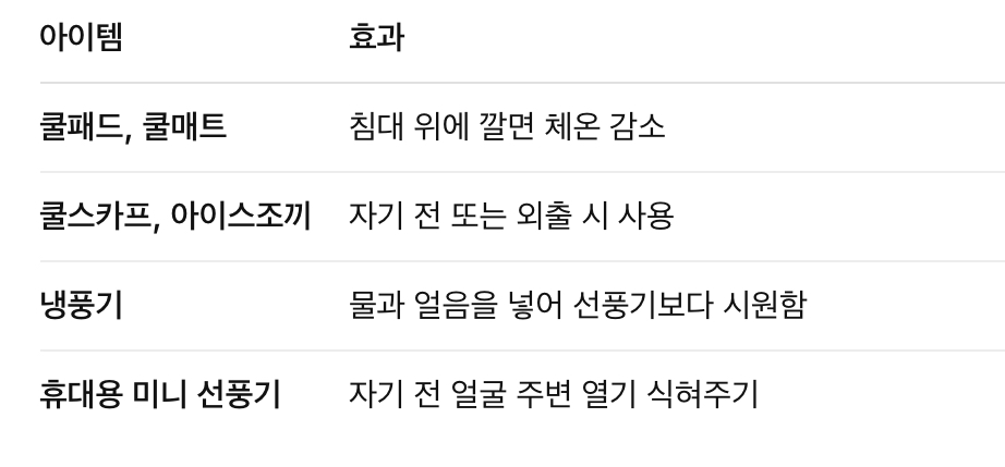 • 냉감 침구 사용: 접촉 냉감 기능이 있는 매트, 베개, 이불 사용