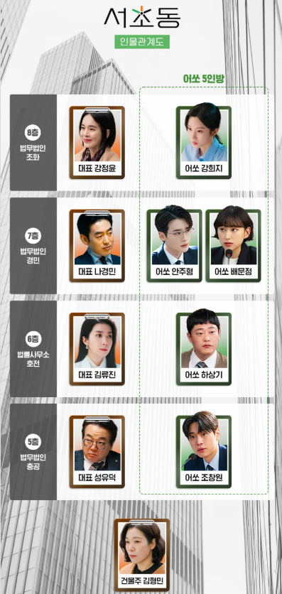 | 무대 배경 | 대형 로펌 내부 중심 | 서초동 법조계 전체 풍경 (로펌, 검사실 등 다양) |
