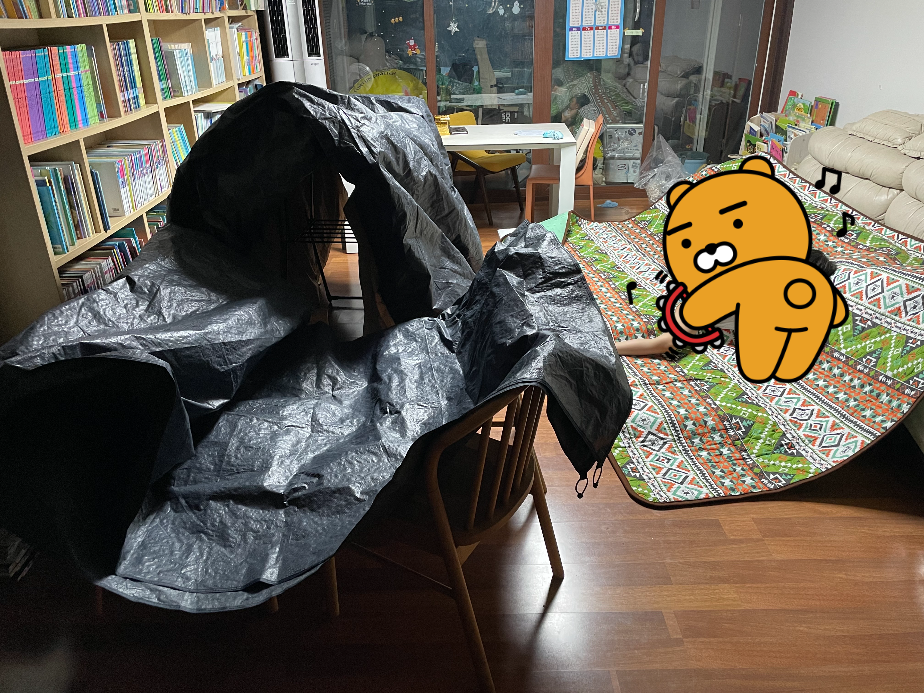 텐트랑 다 꺼내서 거실에서 베란다에서 다 말리고 또 말리고
