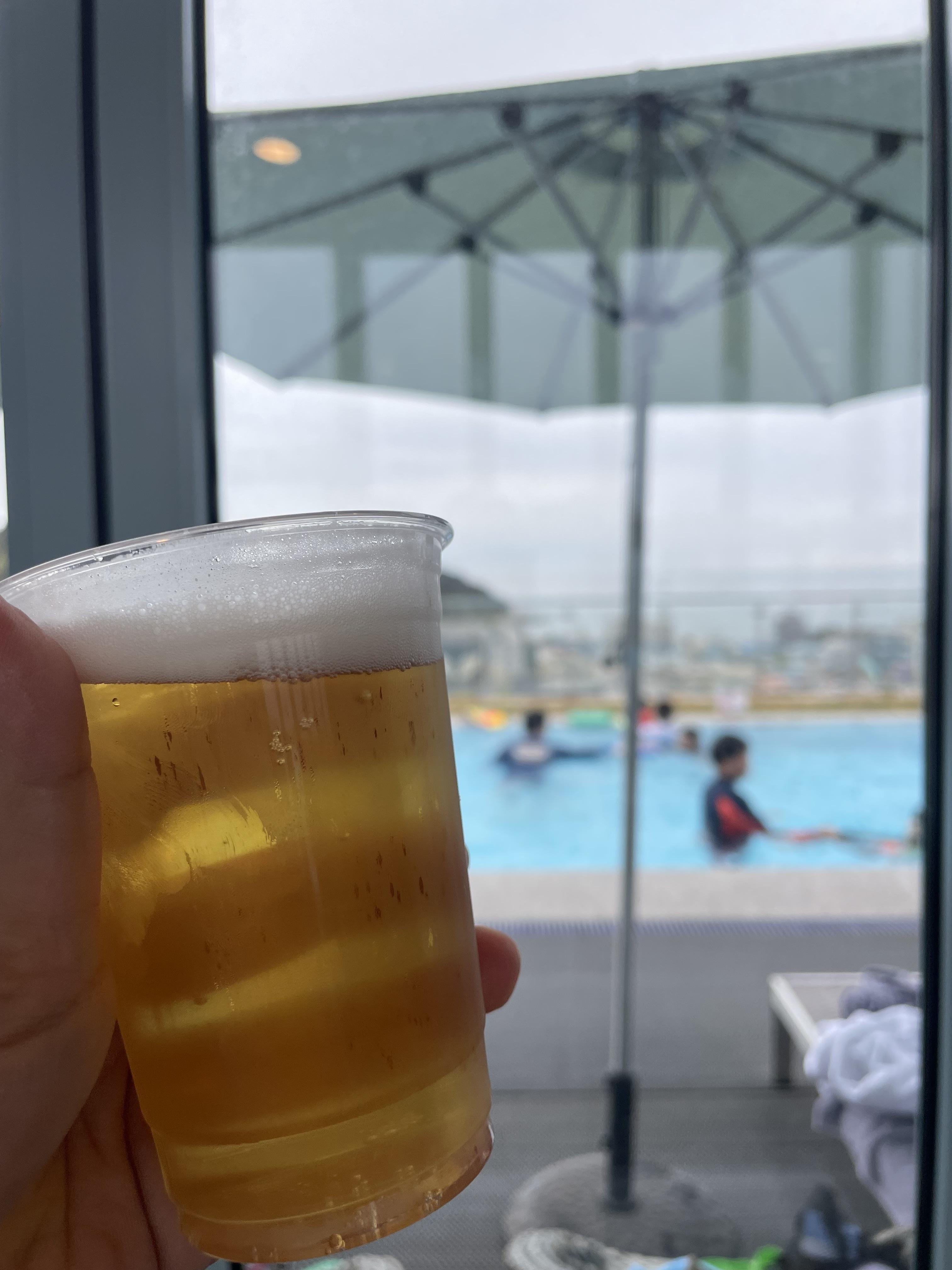 수영장 이용객에게 제공되는 타월을 두르고 저 맥주 한잔을 먹는데 와~~ 피로가 싹 풀린다.