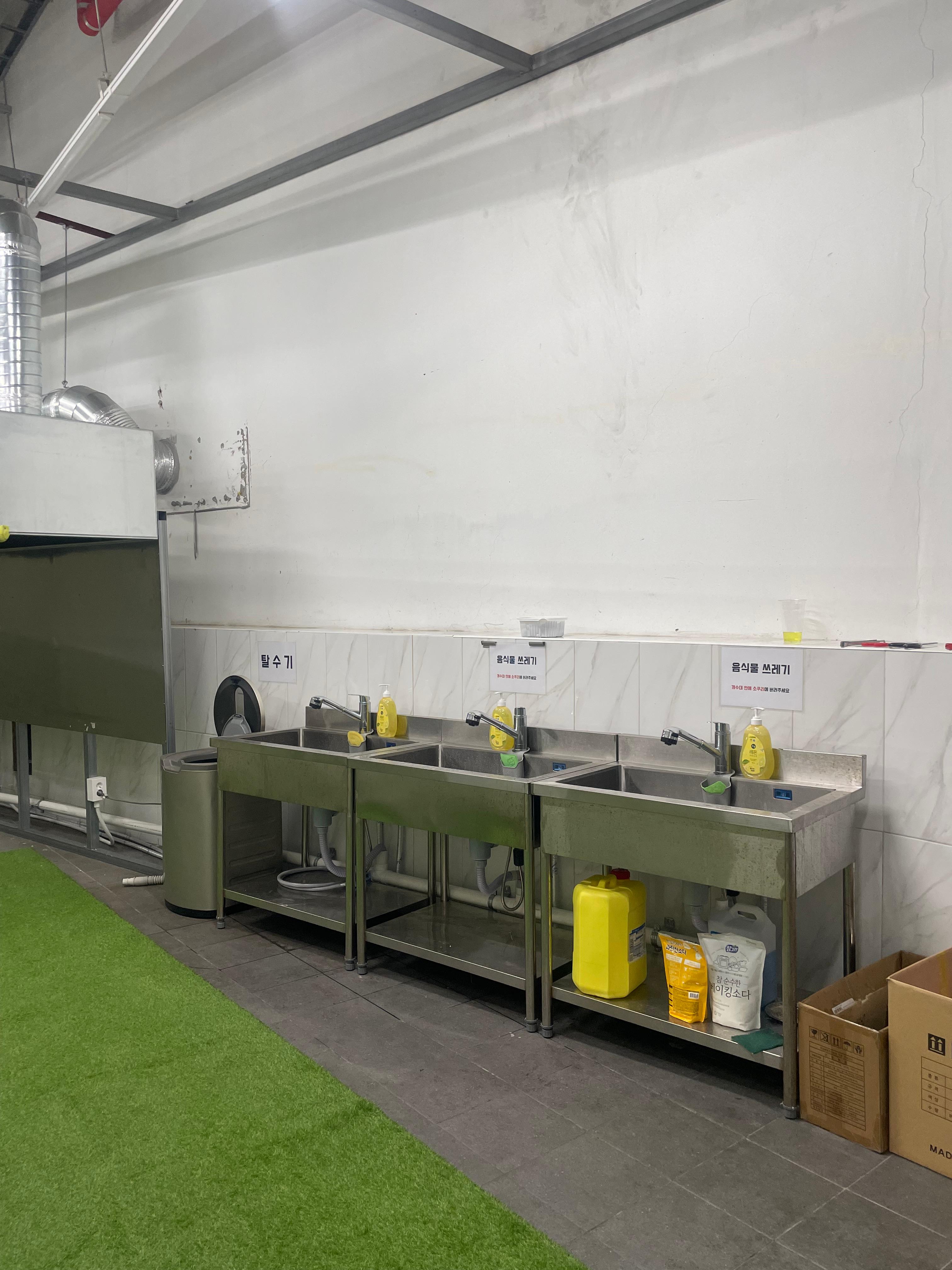 한쪽 켠에 위치한 분리수거장, 개수대와 샤워실