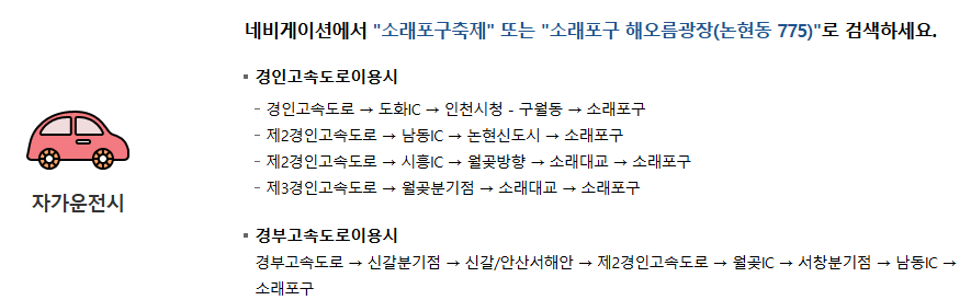 축제 기간에는 앵고개로, 소래역로, 소래역남로16번길, 아암대로 등 1,140면의 임시주차장 무료로 개방