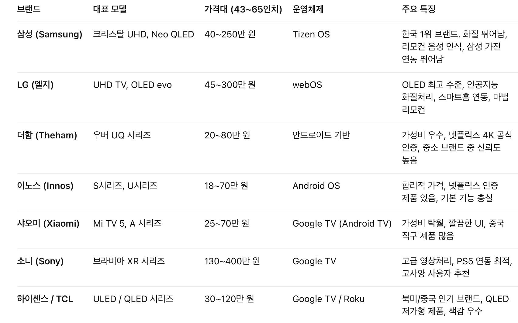 ✅ 스마트 TV 브랜드별 비교 (40~65인치 기준)