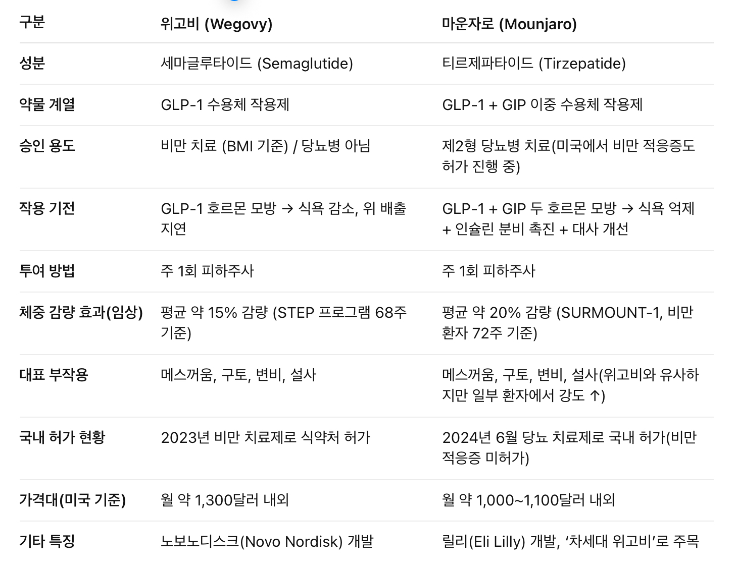 • 마운자로: GLP-1 + GIP (이중 작용 → 대사 개선 효과가 추가)