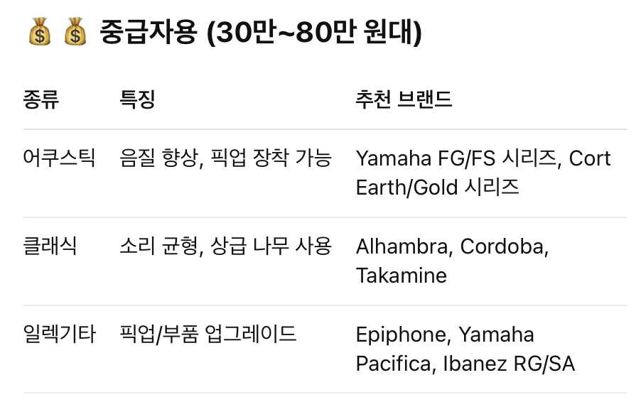 • 가성비 중요 → Yamaha, Cort, Epiphone, Squier