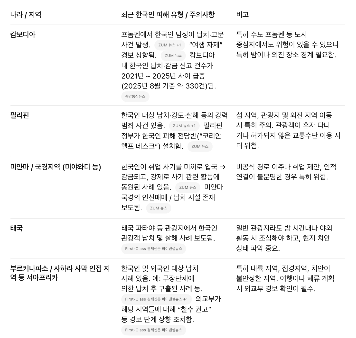 - 태국-캄보디아 국경 일부 지역에서는 군사 충돌 가능성, 긴장 상태 있음. 여행경보에서 이 지역 피하라는 권고도 나옴.