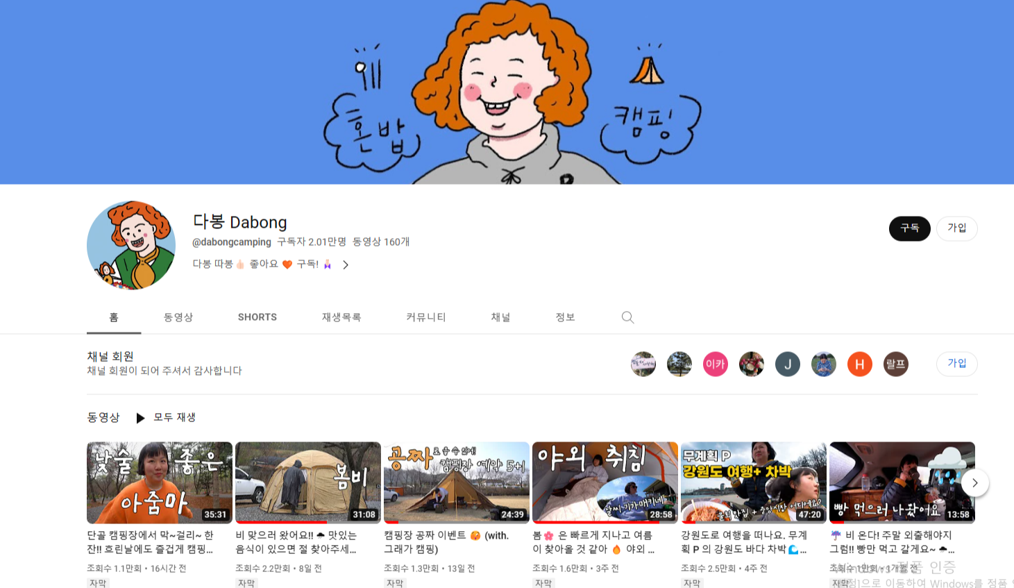 이 채널은 혼캠 아줌마 다봉 캠퍼의 채널이다.