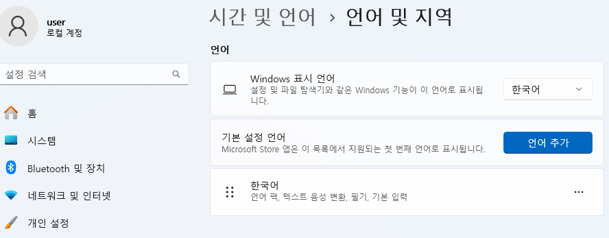 - Windows 설정 > 시간 및 언어 > 언어에서 재설정