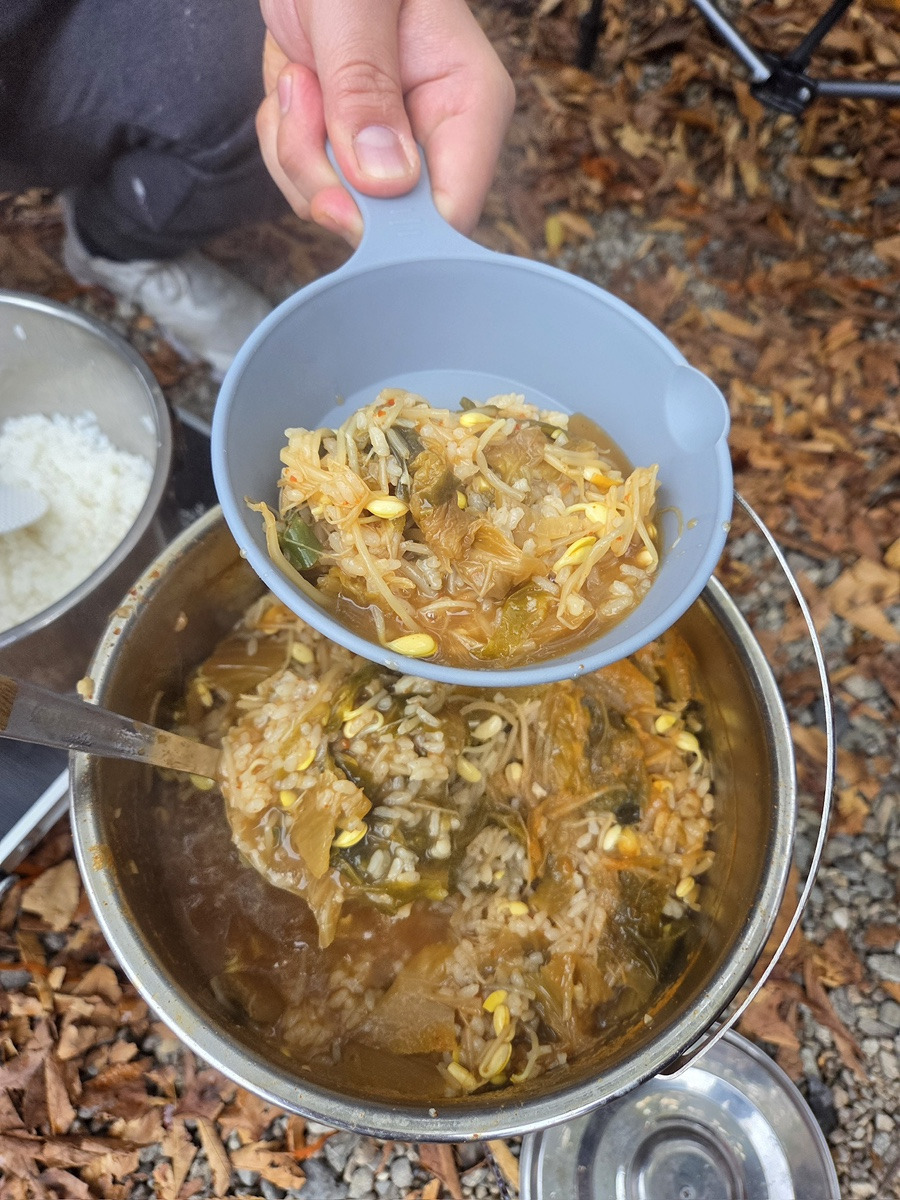 본죽엔 낙지김치죽이 있다면 캠핑장에서 간단하게 콩나물김치죽을 끓여먹어보자.