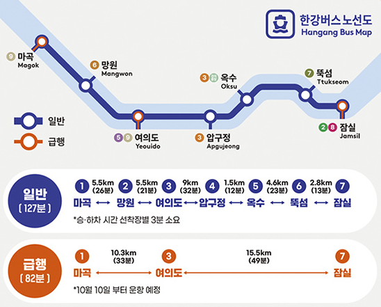 마곡 ↔ 망원 ↔ 여의도 ↔ 옥수 ↔ 압구정 ↔ 뚝섬 ↔ 잠실, 총 7개 선착장, 약 28.9km 구간 운항