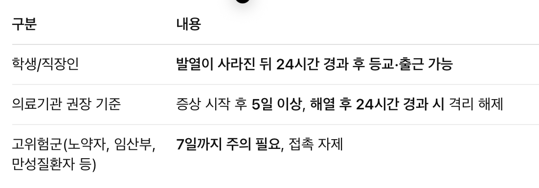 - 격리기간: 증상 시작 후 최소 5일, 또는 해열 후 24시간까지