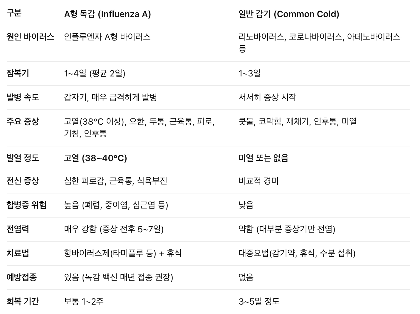 🧬 A형 독감 vs 일반 감기 비교표